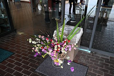 会場入り口にも素敵なお花が飾られ、お客様をお迎えします。