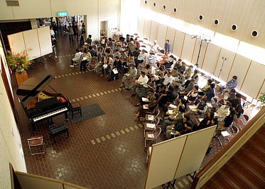 | 出演者の方々との打ち合わせです。 宇宿姉弟のご両親もお見えになりました。 山台を使うと、お二人の位置(目線の高さ)が普段のステージと変わってしまうため、今回はあえて使用を見合わせました。 |