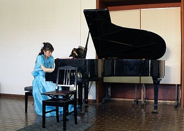 | ピアノソロをもう1曲。 いかにもドビュッシーらしい色彩豊かな作品「喜びの島」。 そして、サン=サーンス作曲「白鳥」 (上の写真は「月の光」を演奏中の真紀子さん) |