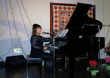 メンバー全員でのハンドベル演奏で「フランス人形」 (左より)小林ゆか、金子絹恵、徳田あつ子、大羽真理子、野村幸恵、安藤悦子、栗田卓美の皆さんです。 ちなみに、大羽陽子さんが後ろでピアノを弾いておられるんですが・・・すっ、すみません!(汗) クリスマスムード一杯の演奏でした。