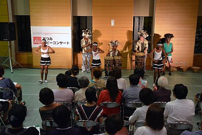 力強く勇壮な太鼓の響きに乗せて、ジャナグルの皆さんが客席後方より踊りながら登場しました。 続いて、子どもたちがお父さんを心配して歌う「パパウェワナ」 色鮮やかな衣装が舞台に映えます。