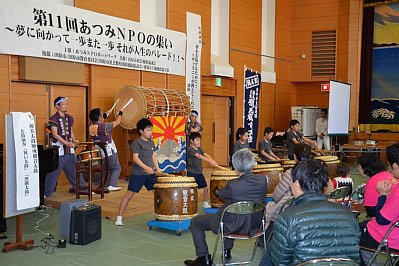 多目的ホールで行われた各団体のステージ発表です。 NPO法人「渥美虹の会」の皆さんによる太鼓の演奏から始まりました。