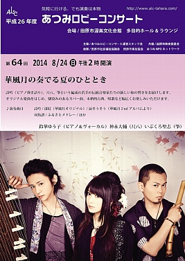 午後2時の開演時間となり、いよいよ前半のステージが始まりました。 いやがうえにも期待に胸が高鳴ります! ヴォーカル&ピアノ 鈴華ゆう子さん、尺八 神永大輔さん、箏 いぶくろ聖志さんの3名によるアコースティックユニット 華風月。 オープニングはインストゥルメンタル「竹林の風」 憂いを秘めた美しいメロディー、そして優しく心地よいサウンドが会場を包み込みます。 続いて「そそら巡り」 |