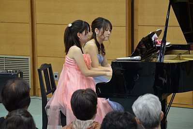 ここで再びピアノ連弾で『秋のメドレー』 「小さな木の実〜夕焼け小焼け〜紅葉(もみじ)〜虫のこえ〜ちいさい秋みつけた」の5曲を。 秋らしいしっとりとした情景豊かな曲や、可愛らしい曲など、ヴァラエティー豊かな選曲で楽しませていただきました。