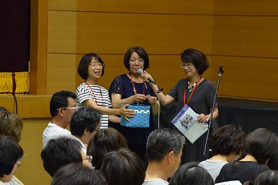 | (上)演奏終了後、スタッフより花束が贈呈されました。 あれっ!スタッフSさんが被り物を!(笑) (下)会場から拍手の嵐がわき起こり・・・ |