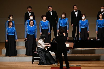 | そして2名の男性が合唱団の列に入り、アンコール「椰子の実」を共に歌います。 じつはお二人は渥美混声合唱団のOB団員。 渥混の団歌ともいえるこの曲はもちろん周知済み。 堂々たる歌いっぷりはさすがに貫禄充分です。 |