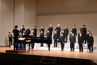 次は「この曲が大好き」とおっしゃる団員の中嶋啓太さんみずからの指揮で 「リフレイン」 これも心に響く素敵な曲ですね。 3曲目は、鴨長明の随筆「方丈記」を元に千原英喜さんが曲を付けられた 「夜もすがら」 そして、日本の伝統芸能である「能」を取り入れた合唱曲 猿楽談義《翁》より「V.翁」 鼓や鈴、そして掛け声などが、いやが上にも能の世界観を彷彿とさせます。 |