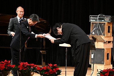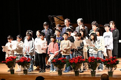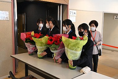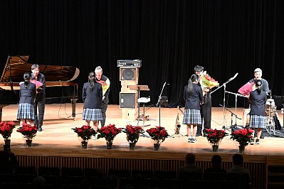 | 演奏終了後、ドリームの会の生徒さんより太田剣カルテットの皆さんへポインセチアが贈られ、客席から惜しみない拍手が・・・ |