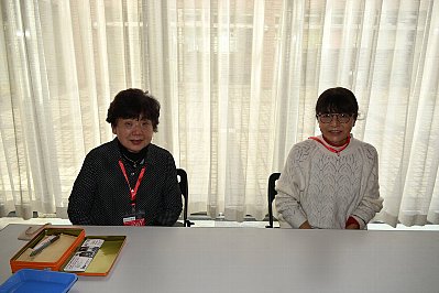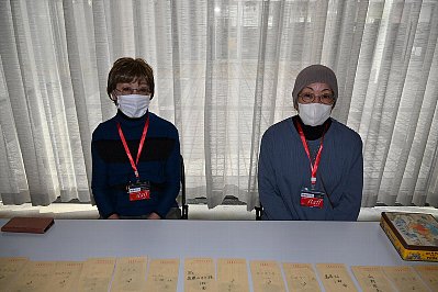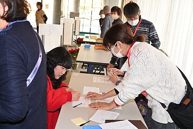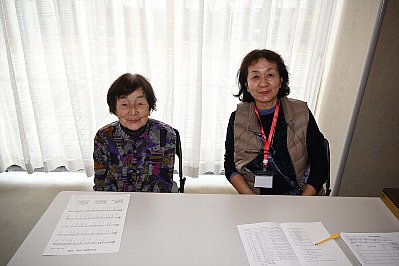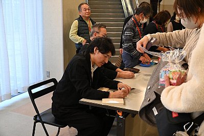 | 入場者情報記入コーナーはスタッフHさん。(右) お願いしま〜す! ちなみに、左は某スタッフのお母様。 毎回、車でお母様の送り迎えをされる、心優しき男性スタッフです。 |
