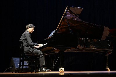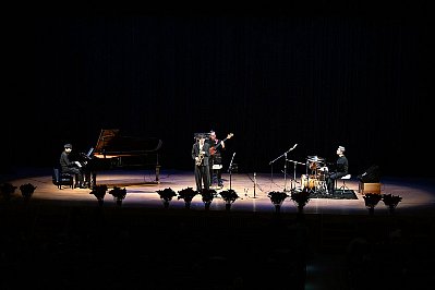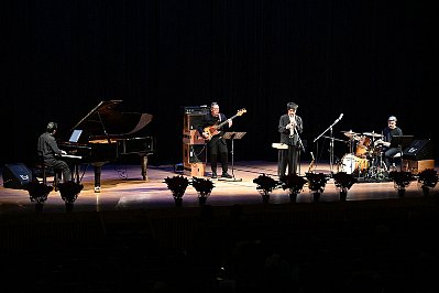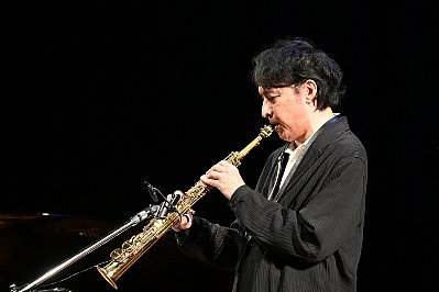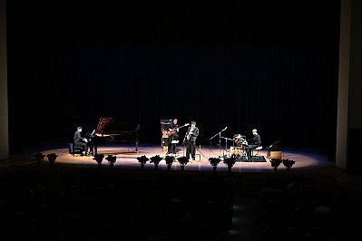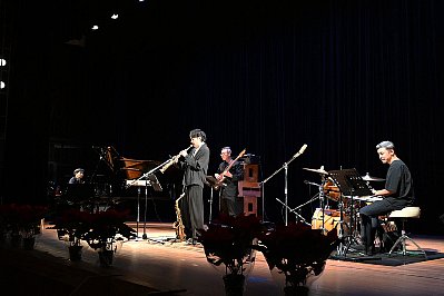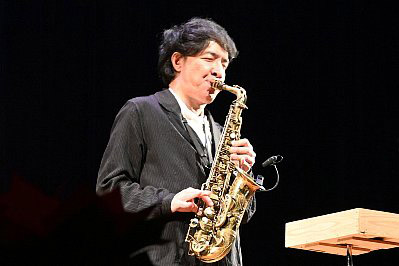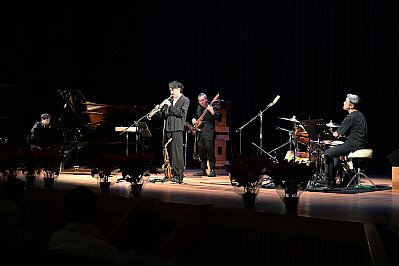 | 式典が終わり、いよいよ “太田 剣 カルテットライブ!!”のスタートです! 1曲目は太田さんのオリジナル Two By The Pond(釣り堀) ソプラノサックスで奏でられるキャッチーなメロディーが印象的なこの曲、どっかで聴いたような・・・? と思ったら、太田さんが当コンサートの100回記念イヤーに出演されたときに演奏された曲だったんですね。 オープニングに相応しいノリノリなナンバーです! |