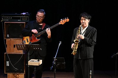 (右)曲によってアルトサックスとソプラノサックスを吹き分ける太田さん。音色の違いがとても面白くて興味深かったです。 (左)織原さんのフレットレスベースの音色って、とっても甘くて綺麗ですね。まさしくリードベース! |